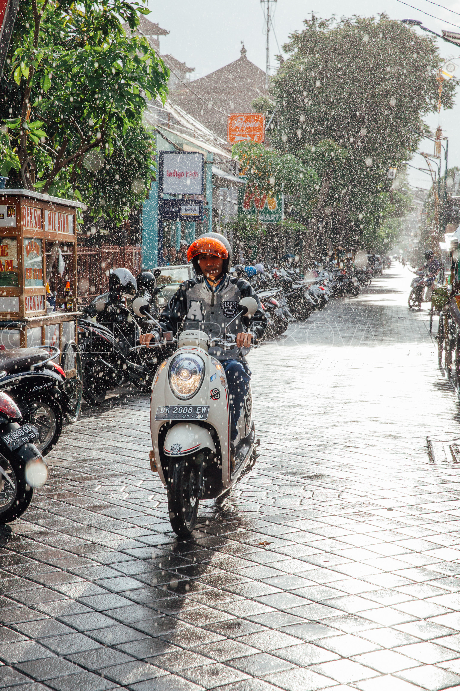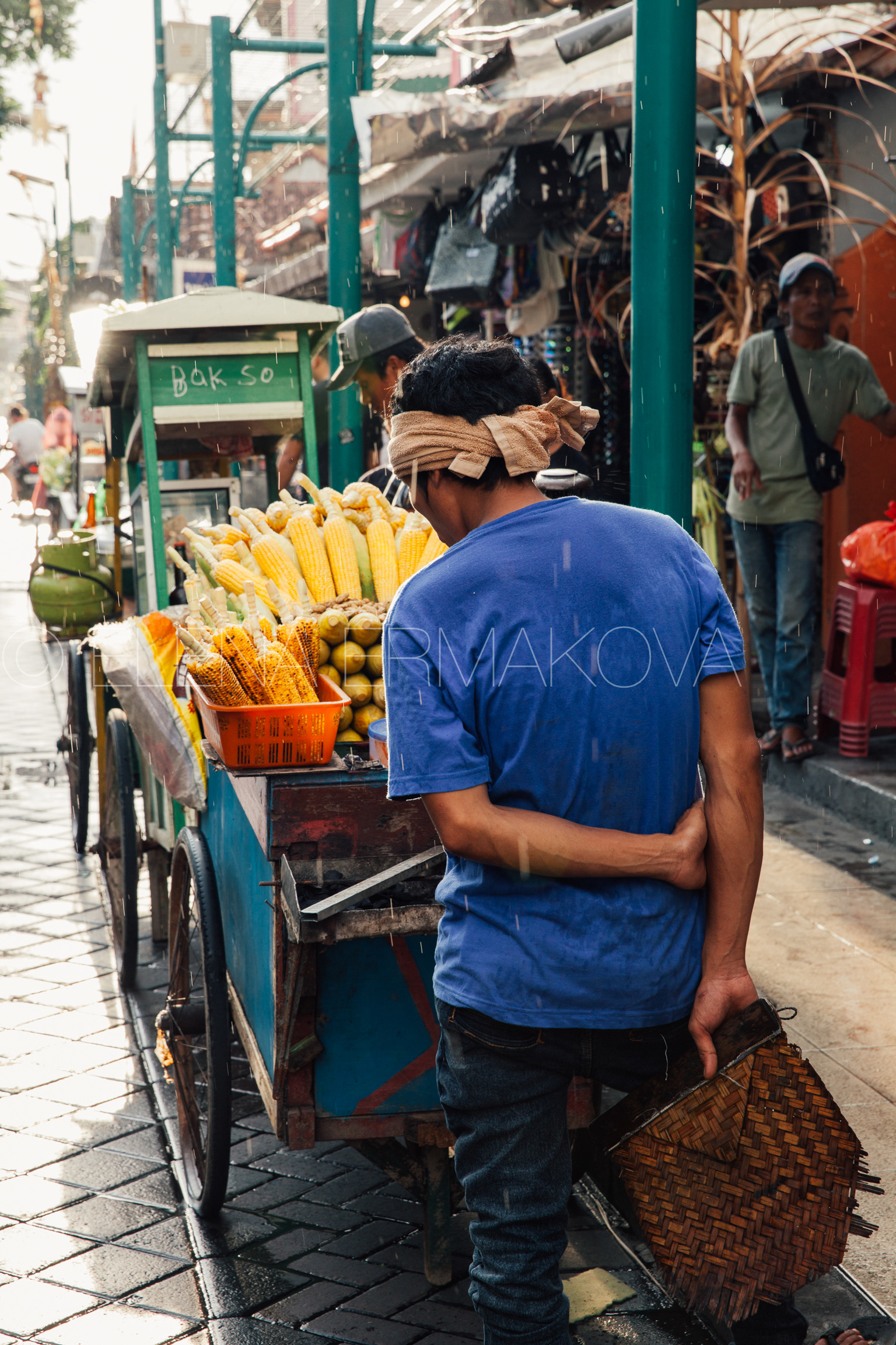 Indonesian food vendor hides from the rain under umbrella of his stall on the street of Kuta, Bali, Indonesia.